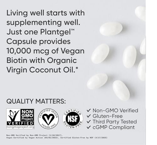 VEGAN CERTIFIED: Our biotin is Vegan Certified and encapsulated in the world’s only non-GMO verified, bovine, and carrageenan-free, Plantgel capsule. It’s filler-free, formulated with organic coconut oil, and Manufactured in the USA in cGMP-compliant facilities