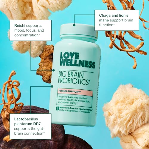 Love Wellness Big Brain Probiotics | Nootropics Brain Support Supplement | Brain Supplements for Memory and Focus | Promotes Mental Clarity & Mood | Organic Reishi, Chaga, & Lions Mane | 30 Count
