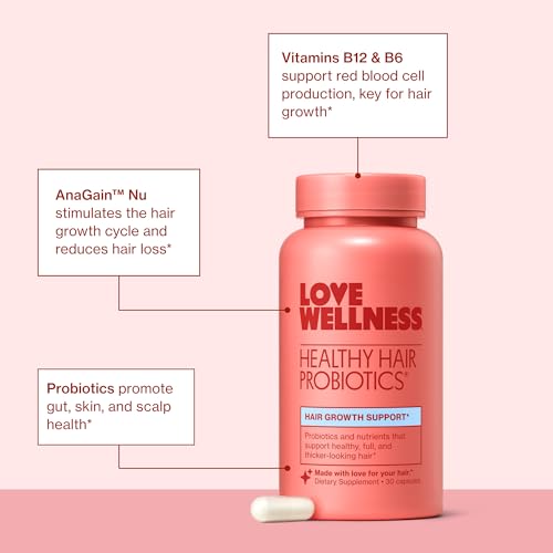 Love Wellness Healthy Hair Probiotics | Support Hair Growth with Biotin and Vitamin B12 & B6 | Supplement for Healthy Scalp & Thicker, Fuller Looking Hair | Safe & Effective | 30 Capsules