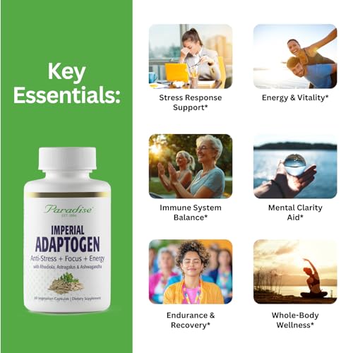 Paradise Herbs, Imperial Adaptogens, with Ashwagandha, Astragalus, Rhodiola, Proprietary Adaptogen Blend for Stress Support, Focus & Energy, 60 Vegetarian Capsules