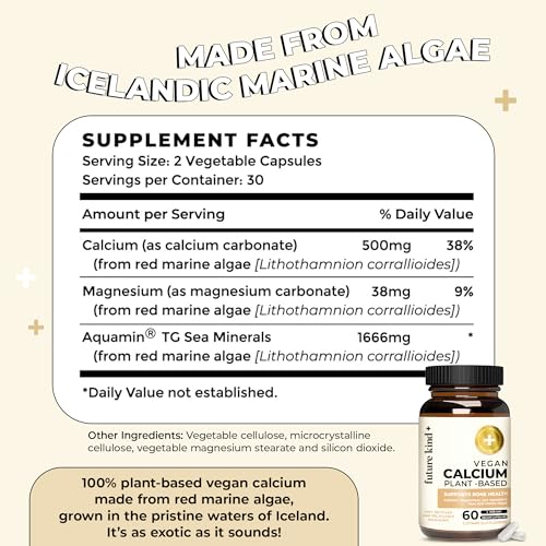 Future Kind Vegan Calcium Supplement – Plant-Based Calcium Magnesium Supplement Sourced from Iceland for Teeth & Bone Support (60 Capsules)