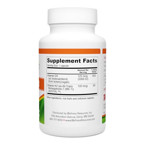 Wellness Resources Vegan Vitamin D3 5000 IU and Vitamin K2 100 mcg, 2 in 1 Vitamin D3 K2 MK-7 for Bone Health, Immunity & Arterial Health, Plant Based D3 MK7, Vitamin D Third Party Tested 60 Capsules