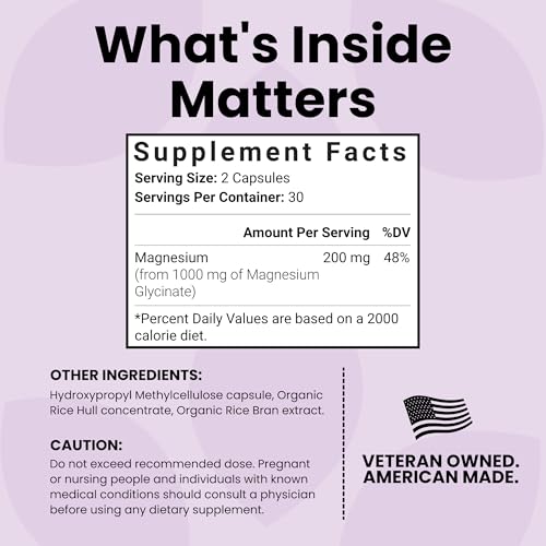 Pure and High Potency: Our formula contains 1000mg of pure magnesium glycinate vegan, equivalent to 200mg of high absorption magnesium mineral supplement for muscle cramps and natural mood boosting. Or take one capsule for chelated magnesium glycinate 500mg.