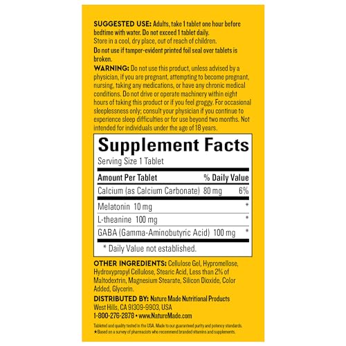 If you need help falling asleep or staying asleep because your mind just can’t stop racing at night, then Nature Made Wellblends Sleep Longer is here to help. This 100% drug-free occasional use sleep aid provides 3 benefits in 1 blend with ingredients powered by science to improve your sleep quality. These Maximum Strength(2) Melatonin 10 mg time-release tablets immediately release Melatonin to help you fall asleep faster, and later release more Melatonin to support a restful night’s sleep. Formula includes L-theanine 100 mg to help relax your mind and GABA 100 mg to support a calm mental state. Adults, take one tablet one hour before bedtime with water. Do not exceed one tablet daily. With Nature Made Wellblends Sleep Longer, you can finally get the sleep of your dreams. For other sleep supplements, try our Nature Made sleep aids for adults extra strength and more. (1)Ingredients powered by science (2)Compared to Nature Made Wellblends Melatonin products (3)Melatonin helps you fall asleep faster and supports restful sleep *Based on a 2022 survey of pharmacists who recommend branded vitamins and supplements.